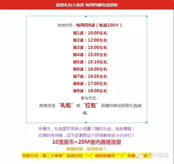 “紅包”到隨州移動公眾號,即可獲得流量紅包鏈接,每波紅包總額